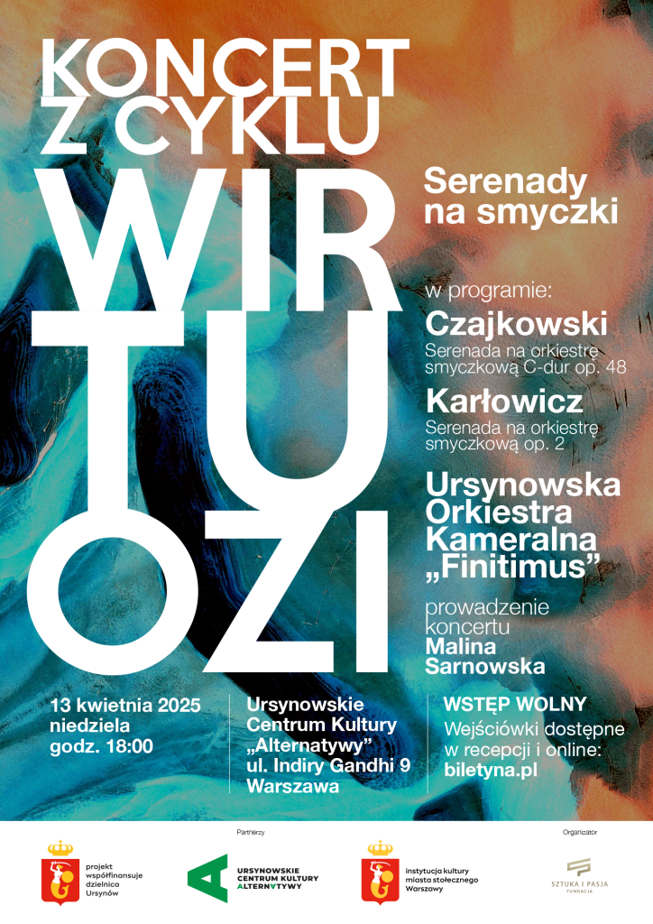Zapraszamy na koncert "Serenady na smyczki" z cyklu "Wirtuozi" organizowany przez Fundację Sztuka i Pasja. Ursynowska Orkiestra Kameralna „Finitimus” zaprezentuje arcydzieła muzyki kameralnej autorstwa Mieczysława Karłowicza oraz Piotra Czajkowskiego. Serenada…